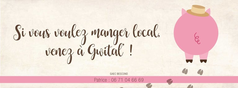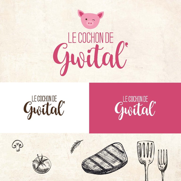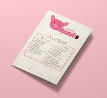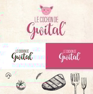 Création complète de l'identité visuelle du Cochon de Gwital', marque de vente directe à la ferme, et déclinaisons des offres sur dépliants.